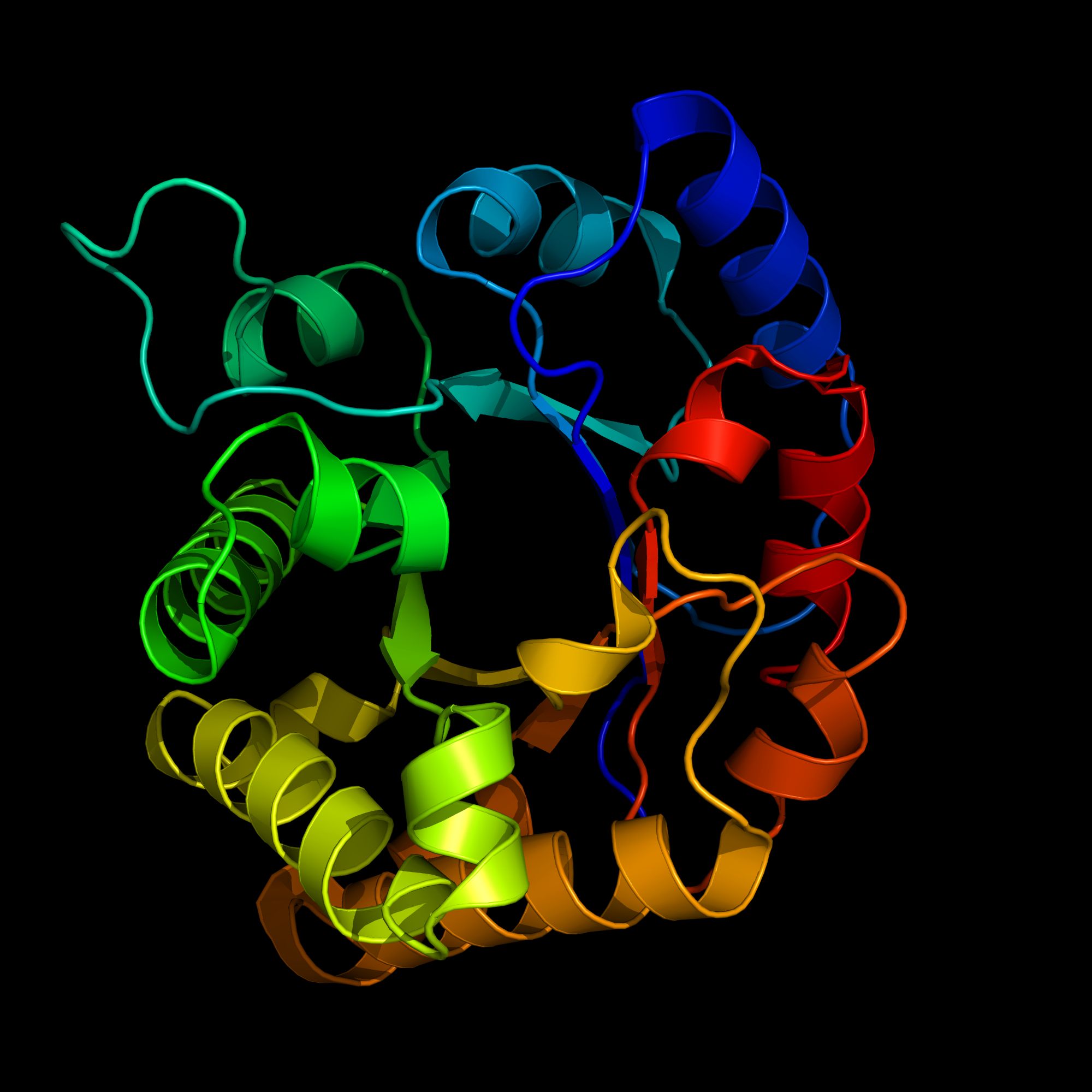 Picture description: Ribbon diagram of the catalytic perfect enzyme triose-phosphate isomerase (TIM).